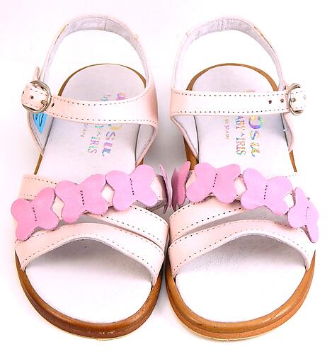 - Fuchsia butterflies set off criss-cross straps