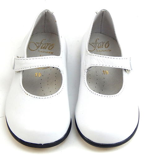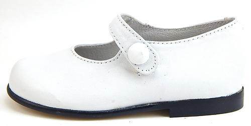 Classic button shoes in premium white leather, updated with snap closure. Handcrafted in Spain using top quality components. Full leather breathable lining and insole with cushioned arch support. Internal "counters" for support and good wear. Leather-substitute sole with slip resistant finish. Last pair. MSRP $65.00.